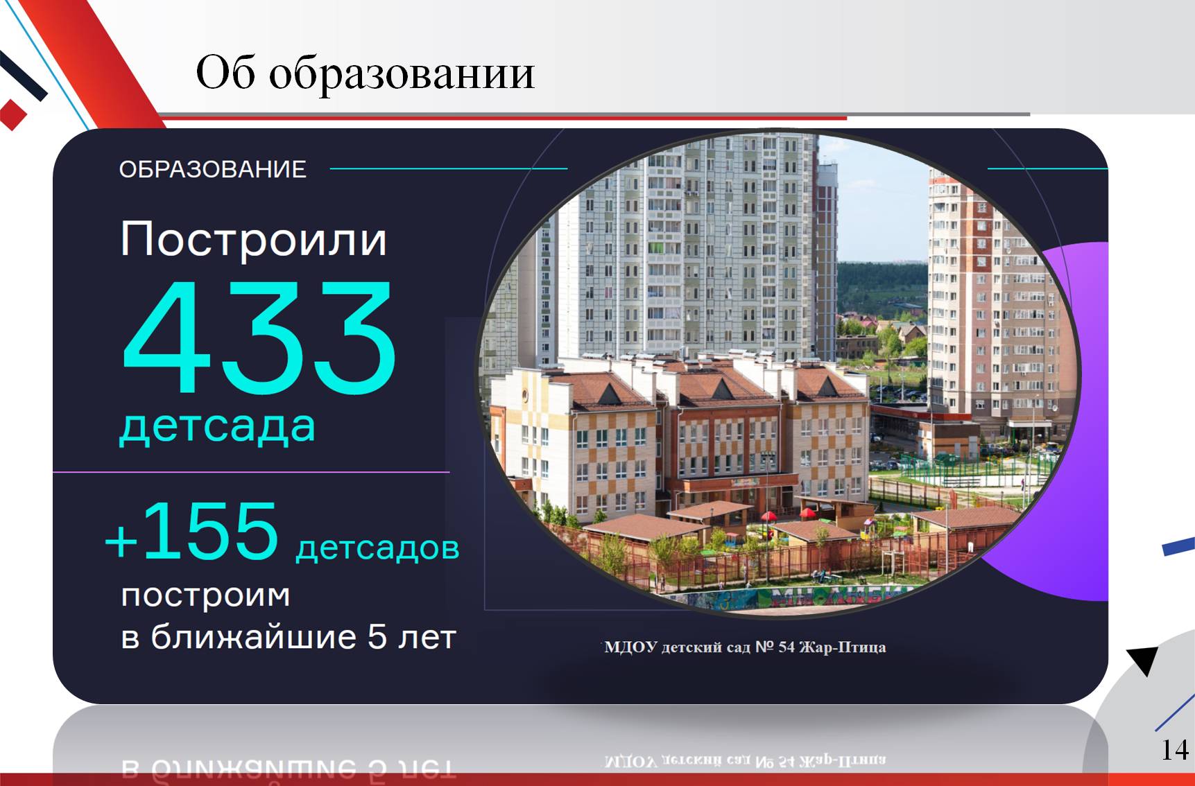 В ближайшие 5 лет к уже построенным 433 садам в Московской области будет построено еще 155. За семь лет построено 155 школ. В 2019 году началось строительство 50 новых школ. 33 из них планируется сдать в 2020 году